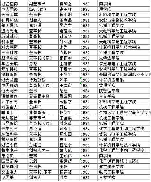在企業(yè)家篇部分,將系統(tǒng)性展示老一輩(其實(shí)沒有那么老了)創(chuàng)業(yè)者的風(fēng)采,浙大培養(yǎng)出了多少上市公司掌門人,哪個(gè)專業(yè)的牛人最多,A股的打工皇帝是哪個(gè)校友,哪些上市公司是同學(xué)、夫妻創(chuàng)業(yè)的……白皮書將一一解讀。