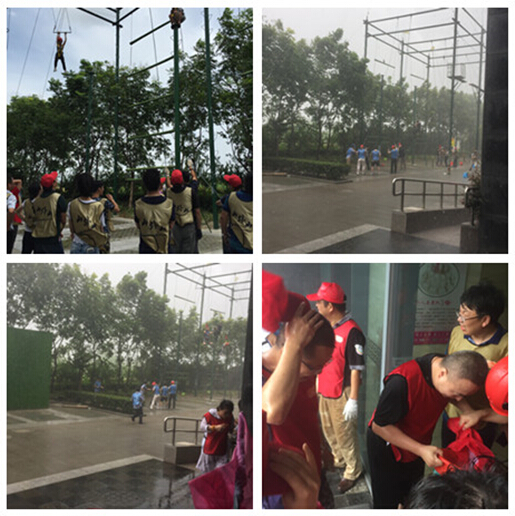 由于狂風暴雨,訓練中途暫停,已經(jīng)爬到頂?shù)膬蓚€同學變成了真正的“雨神”,哈哈,趕緊趕緊救他們下來避雨哦。。。